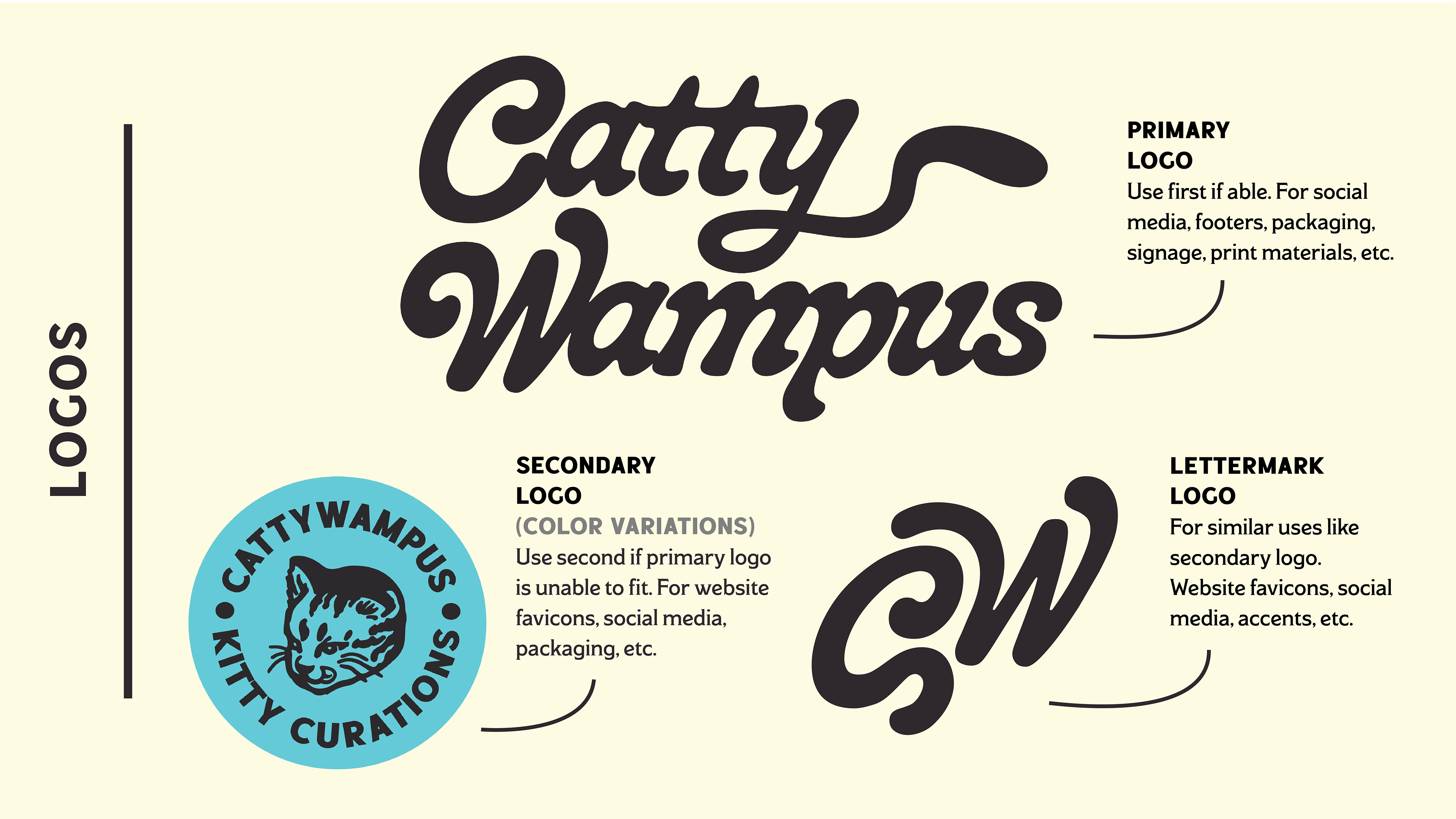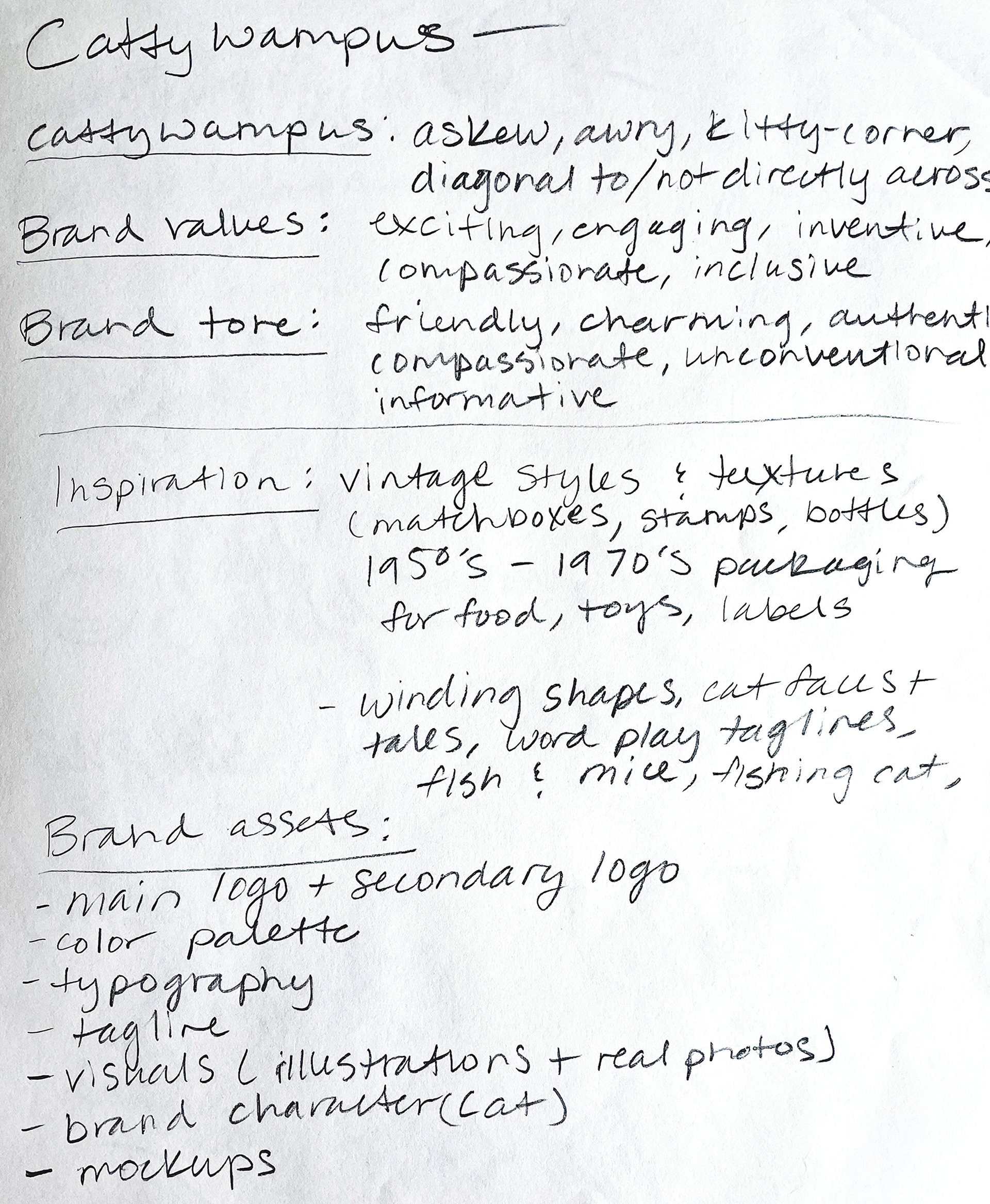 My goal was to create a brand loud about not conforming to the comfort of modern, clean branding. Cats embody the playful, curious, funny, and bold qualities of being cattywampus, and this needed to be obvious.