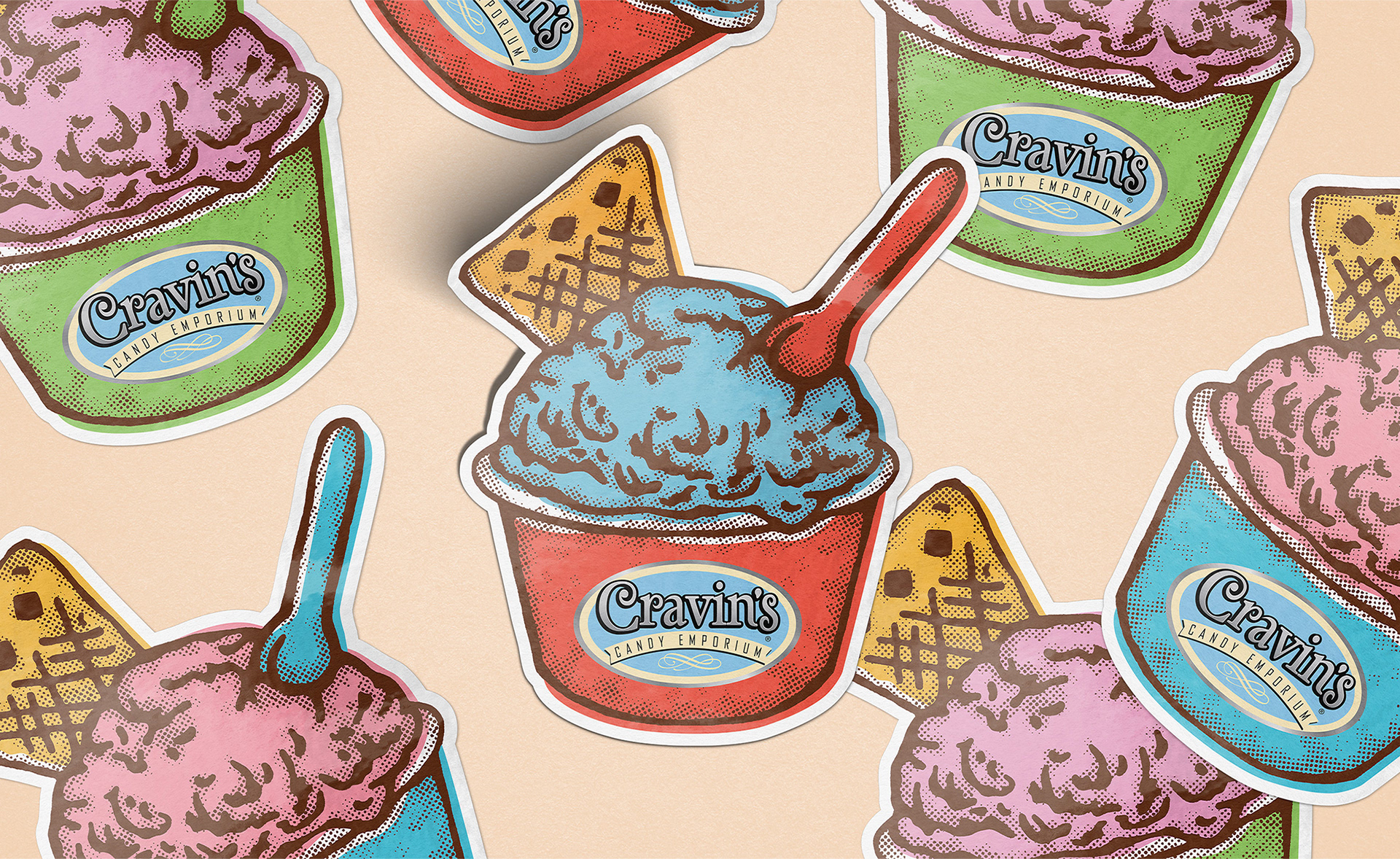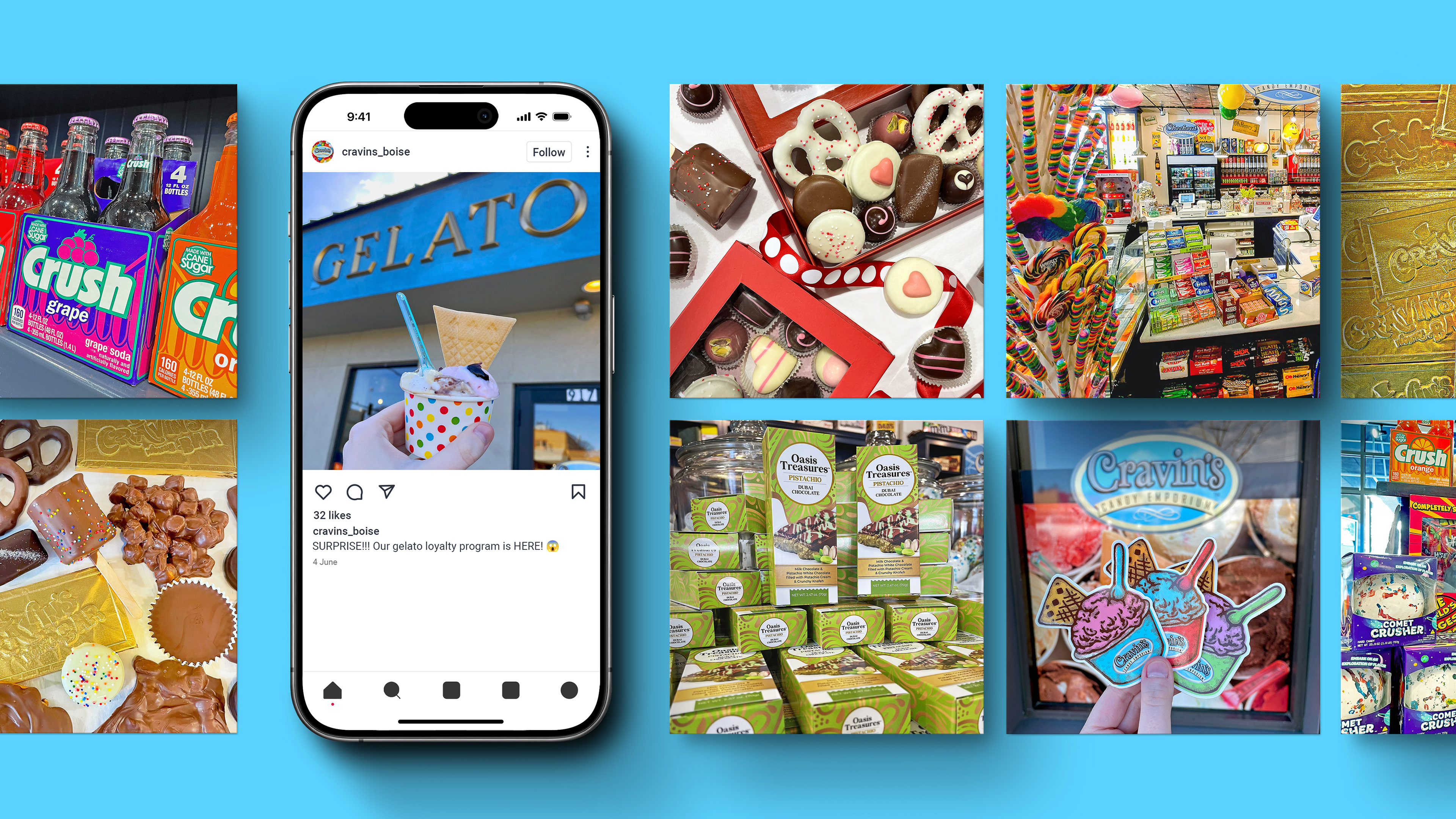 Cravin's Candy Emporium is a small business who offers a wide variety of candy, gelato, handmade chocolates, and novelty items. This brand's aesthetic centers around childhood nostalgia with sweets and memorabilia. Several marketing projects, varying from A-frame signs, to promoting store events, have been delivered.